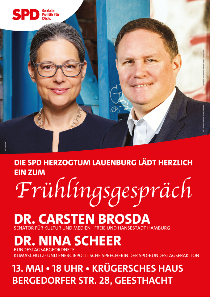 der Kreisverband SPD Herzogtum Lauenburg lädt gemeinsam mit der SPD-Kreistagsfraktion und dem SPD-Ortsverein Geesthacht ein zum "Frühlingsgespräch". Gäste sind Dr. Nina Scheer, MdB, und Dr. Carsten Brosda, Senator für Kultur und Medien - Freie und Hansestadt Hamburg.
